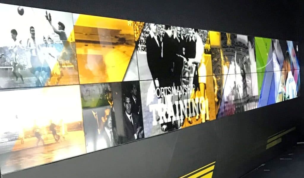 Am Eingang des massiven 50 x 30 Meter großen, von Interp geschaffenen Wanderpavillons begrüßen den Besucher zwei BrightSign-gesteuerte Videowalls aus jeweils 18 Screens, die von Amped programmiert und mit einem Klangteppich unterlegt wurden. Videowände einer solchen Größe zu erschaffen ist an sich schon eine Herausforderung – doch geschieht dies meist nur einmal. Die World of Football Experience jedoch wird mindestens fünfzehnmal auf der ganzen Welt ab- und wieder aufgebaut, und zwar ohne die Anwesenheit der ursprünglichen Designer. Die Videowall muss, aus den Versandkisten ausgepackt, jedesmal wieder fehlerfrei funktionieren.