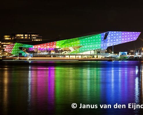 Da die Fassade des Eye Museums viele Facetten hat und keine glatten Oberflächen aufweist, lässt sich hier das Können der Künstler in Sachen Projektionsmapping besonders gut beurteilen. Für die Umsetzung der Fassadenprojektionen kommen zwölf Panasonic-Projektoren zum Einsatz, die rund um das Museum und auch auf Pontons auf dem Wasser platziert wurden.