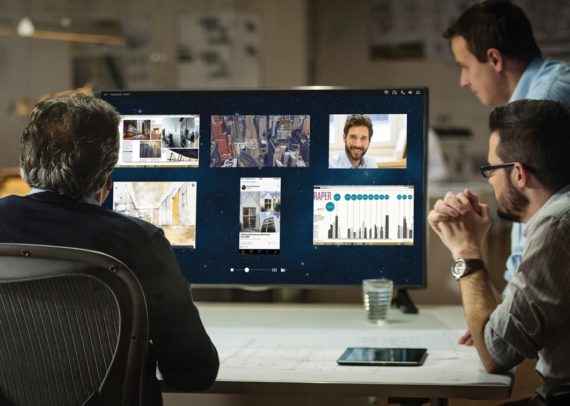 Montage soll nicht nur die Zusammenarbeit in Besprechungsräumen und Huddle Spaces optimieren, sondern auch die Einbindung von Meetingteilnehmern aus der Ferne ermöglichen. Diese können Content von ihren Geräten via App oder Browser auf das Raumdisplay übertragen und der gezeigte Inhalt lässt sich auf bis zu sechs angeschlossene Geräte verteilen. Genausoviele Teilnehmer können gleichzeitig ihre Beiträge anzeigen, eine Leiste neben dem aktiven Screen verschafft einen einfachen Überblick. Die Bedienung des zentralen Bildschirms erfolgt interaktiv über Touchscreen oder per Maus.