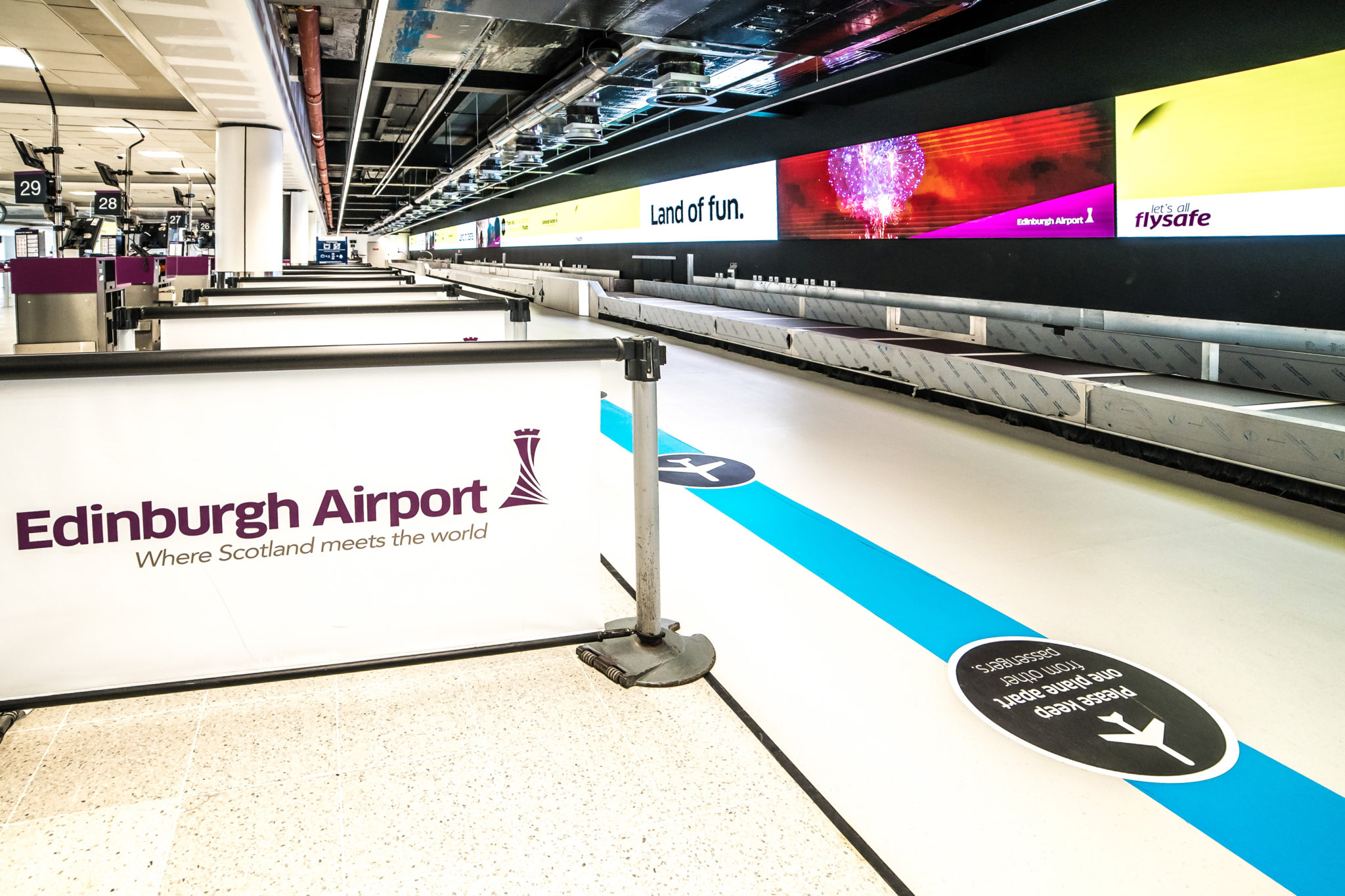 Im Zuge einer umfassenden Modernisierung wurden am Flughafen Edinburgh die bisherigen Check-in-Schalter durch eine 85 m lange LED-Wand ersetzt. Diese zeigt neben Fluginformationen auch Wegbeschreibungen und Werbung für Reisende und insbesondere diejenigen, die die neuen Selbstbedienungs-Check-in-Systeme nutzen, an. Die Wand erstreckt sich über die gesamte Länge des neuen Gepäckkarussells bzw. über die Länge der Halle.