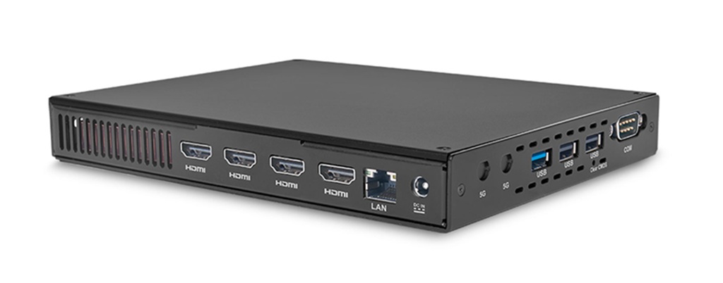 Die Ausstattung des Players ist ganz auf den Digital-Signage-Einsatz ausgerichtet – von vier HDMI-Ausgängen für die parallele 4K-Darstellung mit 60 Hz bis zum RTC-gesteuerten Hoch- und Herunterfahren und dem automatischen Neustart nach Abstürzen (Bild: Concept International)