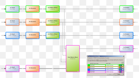 Hypermatrix ermöglicht es, mehrere Harvey-Geräte so zu konfigurieren, als handelte es sich nur um ein einzelnes Gerät. Die einfache Umsetzung großer Projekte aus zahlreichen  Harvey-Systemen ist damit jetzt gegeben. Dabei können mehrere Harveys zentral in einem 19-Zoll-Schrank installiert oder auch räumlich über eine große Fläche verteilt sein. Alle bisher bekannten Merkmale und Funktionalitäten bleiben erhalten. So werden Hypermatrix-Projekte auf bekannte, intuitive Weise mit Harvey Composer erstellt und bearbeitet. Wählt man im Cockpit jetzt “Hypermatrix” als Projekttyp, erscheint der neue Bildschirm “Hypermatrix Device Setup”. Hier können verschiedene Geräte zum Projekt hinzugefügt werden. Alle Ein- und Ausgänge dieser Geräte können wie bisher bei Einzelgeräteprojekten als Blöcke auf dem Arbeitsblatt platziert werden. Die neue Blockfärbung und Mouseover-Hinweise unterstützen den Benutzer und gewährleisten die Übersichtlichkeit. So bleibt klar ersichtlich, wie die Projektverteilung auf die einzelnen Geräte erfolgt.