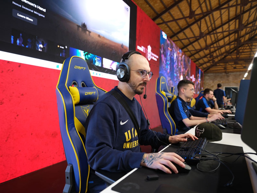 E-Sport-Spieler mit Kopfhörern sowie den Händen an Computer-Tastaturen