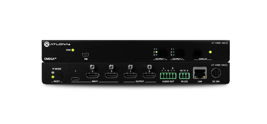 Der Atlona Omega AT-OME-SW32s 3×2 Matrix Switcher mit unterschiedlichen Switching-Modes, mit zwei HDMI- und einem USB-C-Eing, sowie zwei HDMI-Ausgänge. Foto: Atlona (Bild: Atlona)