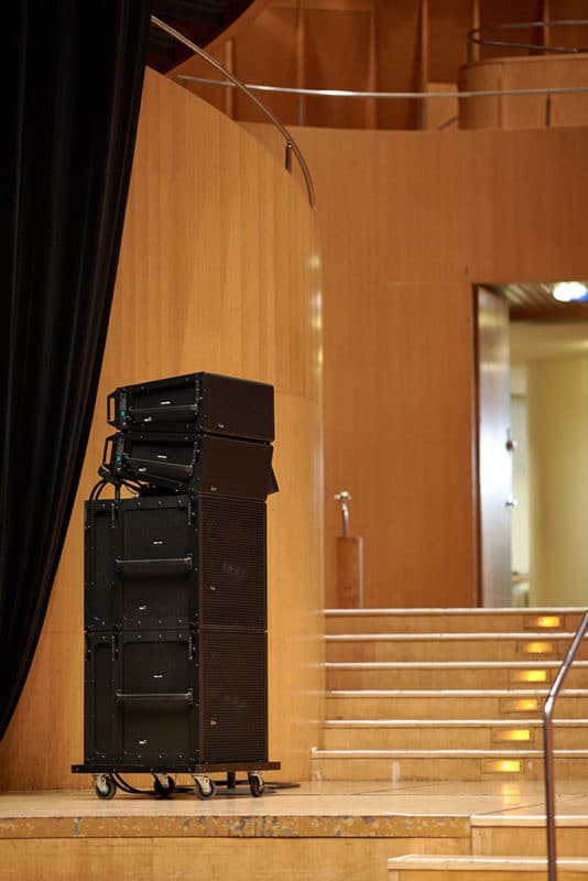 Das Beschallungssystem in der Kölner Philharmonie basiert auf geflogenen Main Arrays aus je sieben Leopard links und rechts und 11 Leopard als Center, auf der Bühne kommen links und rechts je zwei Leopard, zwei 900-LFC Low-Frequency Control Elemente und zwei UPJ-1P Compact VariO Lautsprecher zum Einsatz. Als Near Fill werden fünf UPM-1P Ultra-Compact Wide Coverage Lautsprecher genutzt. Gesteuert wird das gesamte System über drei Galileo Galaxy Network Platforms. Der kompakte Leopard ist von seinen Abmessungen gerade noch so klein genug, dass die seitlichen Decken Arrays in die Decke zurückgezogen werden können, sollten sie zum Beispiel für klassische Konzerte nicht benötigt werden. Das Center Array wird komplett in einen Spezialwagen abgelegt und über den Bühnenaufzug in den Keller gefahren. Auch die Bühnensysteme auf der Bühne sind rollbar gebaut und werden spielfertig nur noch eingesteckt. Das verkürzt die Rüstzeiten enorm. Im Zuge der Beschallungssanierung wurden auch die Aufhängungen für die Deckenarrays, der Wagen für das Center Array sowie alle Kabel und die Stromversorgung erneuert.