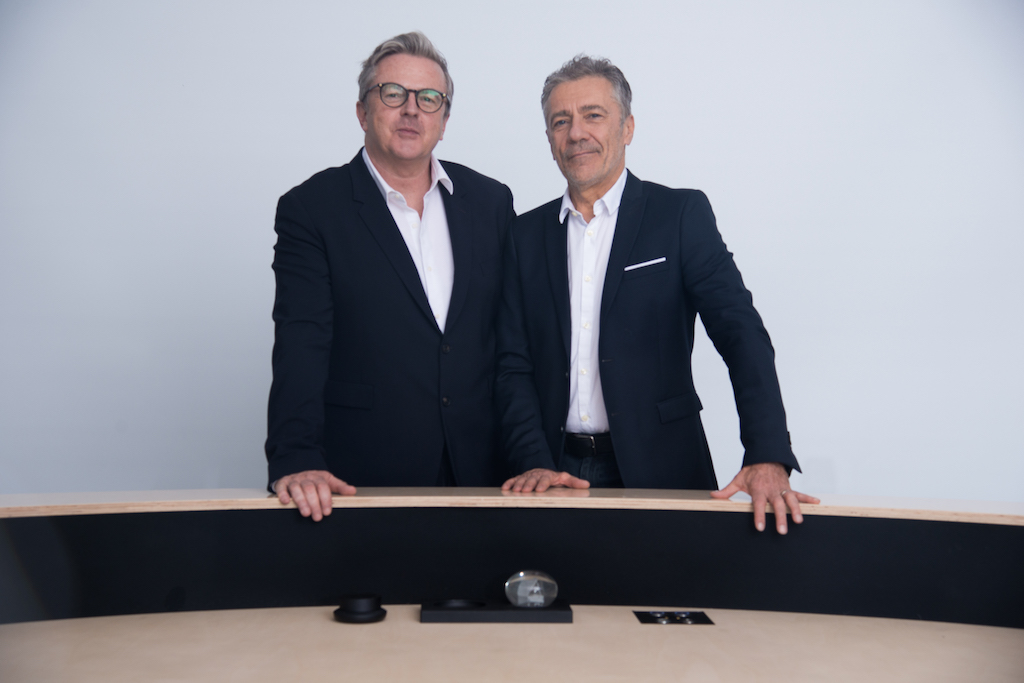 Christian Heil, Präsident und Gründer von L-Acoustics (rechts) und Paul Keating, Mitbegründer von DeltaLive UK (links) geben die Übernahme von DeltaLive UK durch L-Acoustics bekannt – im Bild mit dem L-Acoustics Creations Personal Auditorium „Island“