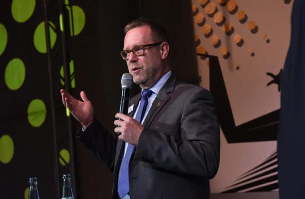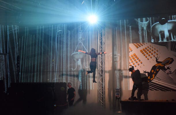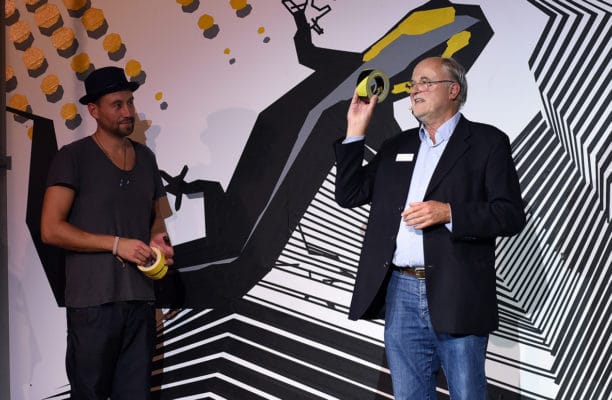„Mal was anderes“ war vom Publikum zu hören. Auch dass der Hauptsitz des Anbieters für Veranstaltungstechnik Kassel ist und dort gerade die Documenta 14 stattfindet, wurde nicht vergessen. Den Abend begleitete nämlich die Anfertigung eines Tape Art-Bildes auf einer 10m² Wandfläche, geschaffen von der Klebebande, einem Künstlerkollektiv aus Berlin. Herr Reinhard Naumann, Dr. Bernd Schmidt und Peter Hartmann, Geschäftsführer der Lux AV, setzten ihren Klebestreifen auf das Kunstwerk und starteten damit dessen Finalisierung an diesem Abend.