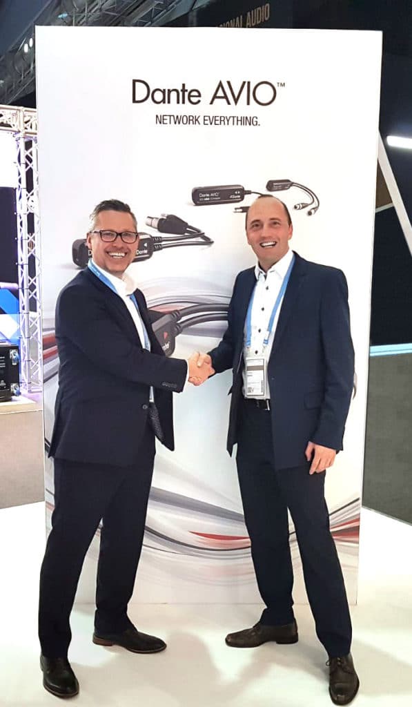 Steve Greenall, Vertriebsleiter EMEA von Audinate (links) und Thorsten Siebers, Geschäftsführer Monacor International (Bild: Monacor International)