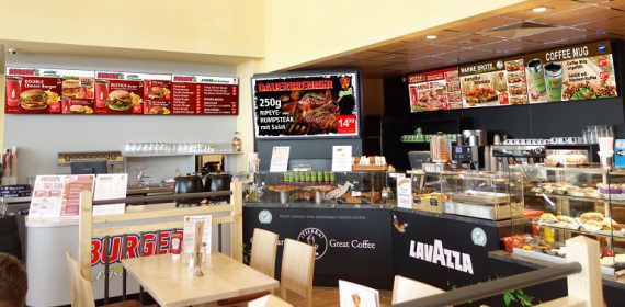 Neben den bisher in 24-Autohöfen deutschlandweit eingesetzten TV-Dreier-Gondeln (im Dreieck angeordnete 47 Zoll Monitore) mit belüfteten Sichtschutzblenden in Logoform kamen diesmal, anstatt der bei Systemgastronomen üblichen analogen Leuchtdia-Menüboards, sechs prächtige 49 Zoll Monitore und ein Center-Screen mit 70 Zoll zum Einsatz.