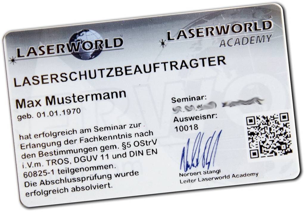 Das Laserschutzseminar behandelt dabei alle wesentlichen Inhalte zur Erlangung der Kenntnis als Laserschutzbeauftragter gemäß OStrV in Verbindung mit den TROS. Eine Urkunde und ein Nachweis im Scheckkartenformat bescheinigt die erfolgreiche Teilnahme am Seminar zum Laserschutzbeauftragten.