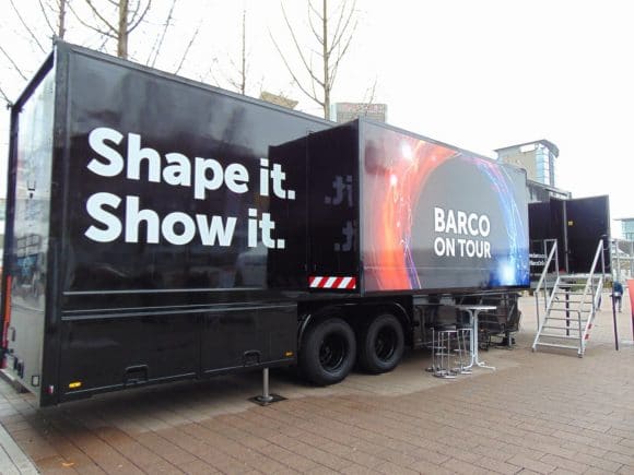 Barco ist nicht mit einem Stand vertreten, hat jedoch diese Woche mit seinem Roadshow-Truck vor der Halle 4 einen Stop eingelegt. Hier erfuhr ich fast nebenbei, dass zum ersten Mal der UDM 4k22 der Öffentlichkeit in Aktion vorgestellt wird. Der DLP-3Chip Laserprojektor ist relativ klein, kompakt und wiegt um die 40 kg. Alle vorhandenen Barco-Optiken passen auch auf den UDM-Beamer, der in Stärken von 14 TLumen bis 22 TLumen noch in diesem Jahr lieferbar ist. Außerdem hat Barco den hellsten 4K Laserprojektor unter 100 kg an Board. Der UDX 4K40, ein 3Chip-DLP-Projektor mit Laser-Phosphor-Lampe, leuchtet in 4K-Auflösung mit 37500 Lumen (!) und einem Farbraum von Rec 709. Zudem ist er noch 24/7 tauglich. Auch sonst ist ein Besuch des Trucks empfehlenswert, da dort viel Technik aus den unterschiedlichsten Bereichen -superkompakt und zum Ausprobieren – integriert ist.