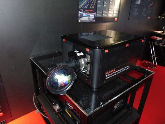 Digital Projection ist gleich zweimal vertreten in Halle 4. Am eigenen Stand zeigt man eine echte Weltpremiere. Zum ersten Mal der Öffentlichkeit vorgestellt wird der Remote-Lightsource Projektor. Der Clou: Der Projektor besteht quasi aus zwei Teilen. Der Kopf mit Objektiv ist getrennt von Elektronik und Netzteil – die werden vor Ort mit Glasfaser-Kabel verbunden. Auch eine Mehrfach-Verknüpfung von Elektroeinheiten und Köpfen ist möglich. Zudem kann der Kunde die benötigte Lichtstärke und Auflösung auswählen.
