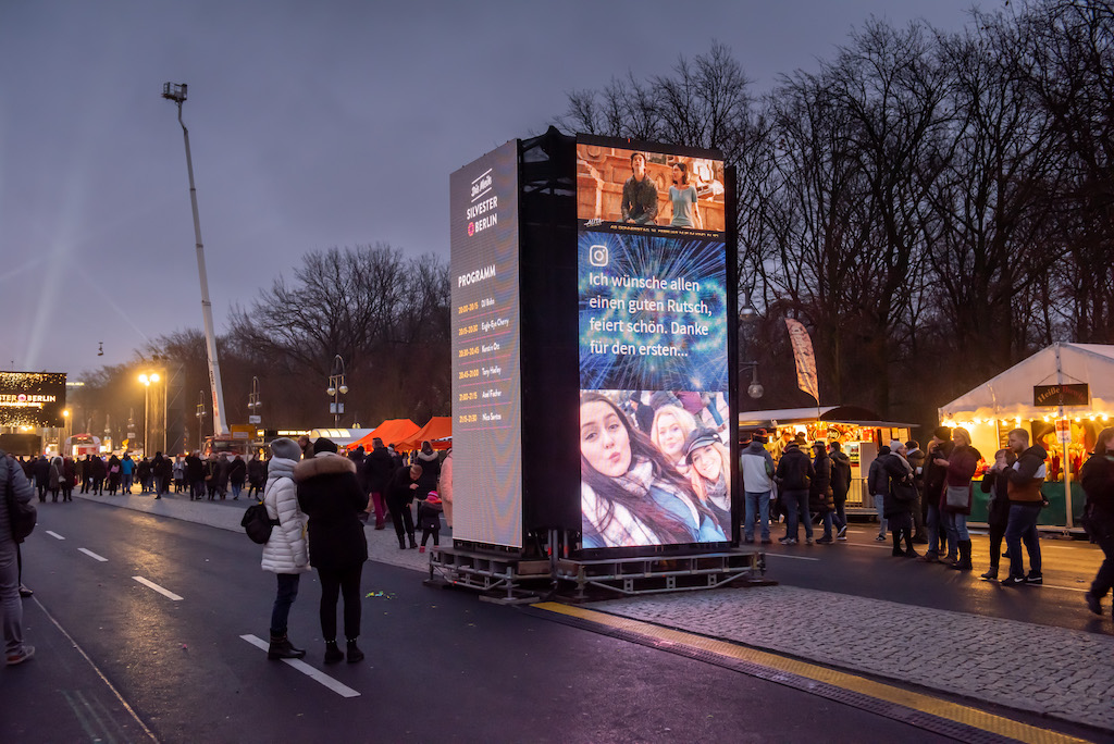 Auf den vier seitlich montierten, individuell bespielbaren LED-Screens können Inhalte verschiedenster Art abgebildet und in Echtzeit aktualisiert werden. Und: Durch die Schnittstelle zu Social Media ist jetzt auch digitale Interaktion mit den Besuchern möglich. Bei der Silvesterparty am Brandenburger Tor in Berlin wurde die erfolgreiche Premiere des Towers gefeiert.