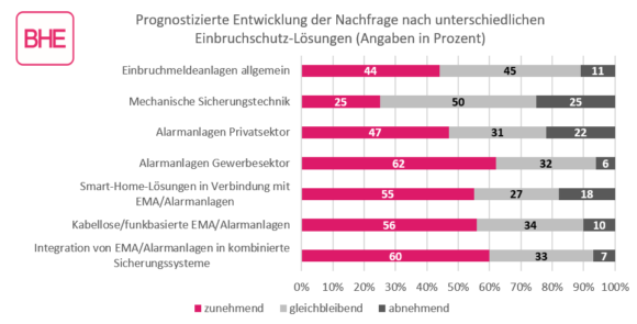 Für die Zukunft erwarten rund 55 Prozent der Betriebe eine zunehmende Nachfrage nach Smart-Home-Lösungen in Verbindung mit Einbruchmeldeanlagen. Rund 18 Prozent halten allerdings einen Rückgang in diesem Bereich für wahrscheinlich.