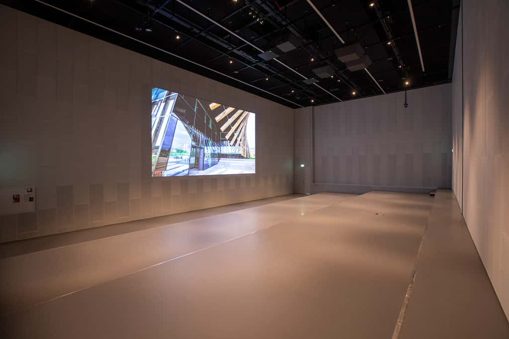 Eine Seite des Raums, die über einen Stufenboden verfügt, wird als „Auditorium 180“ bezeichnet. Hier kommen CAL 96 Säulenlautsprecher von Meyer Sound zum Einsatz, um den Ton auszurichten zu können. Die Lautsprecher verfügen über eine Beam-Steering-Technologie mit Beam-Splitting-Fähigkeit, um die Beschallung auf die abgestuften Sitzbereiche abzustimmen. Die CALs bleiben dabei hinter der perforierten Wand-/Bildschirmoberfläche verborgen.