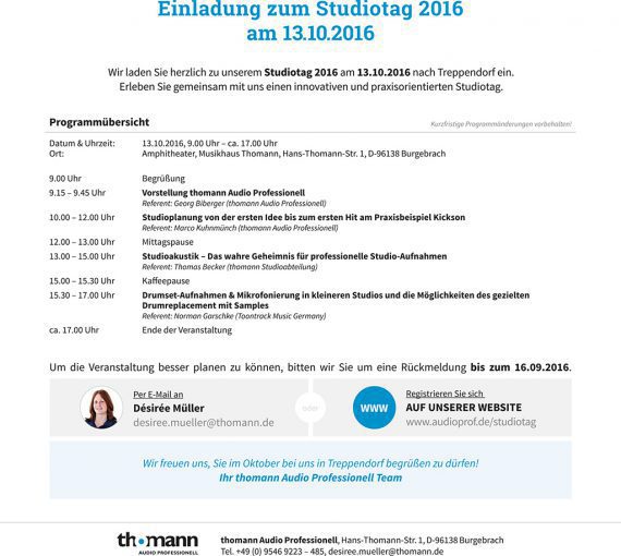 Um die Veranstaltung besser planen zu können, bittet Thomann Audio Professionell um Rückmeldung per E-Mail an Désirée Müller (desiree.mueller@thomann.de) oder um eine Registrierung online unter www.audioprof.de/studiotag bis zum 16.9.2016.