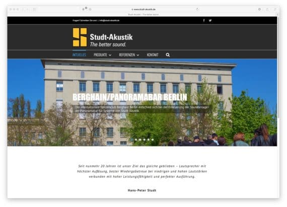 Studt-Akustik aus Dresden hat seinen Online-Auftritt überarbeitet und eine neue Website gestaltet. Ziel von Peter Studt war, diese übersichtlicher, umfangreicher und aktueller zu gestalten als bisher möglich. Dargestellt werden die komplette Produktpaletten der Pro Audio Line, Cinema Line, Cinema Studio Line und Controller Amplifier Line. Zu den aktuellen Projekten gehört zum Beispiel BERGHAIN/PANORAMABAR BERLIN: Der internationale Spitzenclub Berghain Berlin entschied sich bei der Erneuerung der Soundanlage der Panoramabar für Beschallungssysteme von Studt-Akustik.
