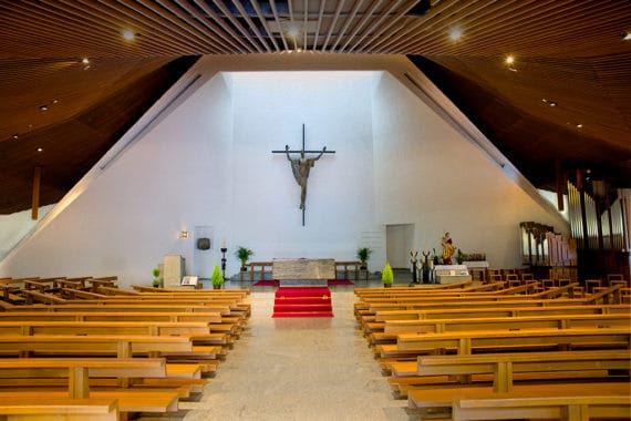 Altarraum der Herz-Jesu-Kirche in Brig (CH) mit optisch integrierten Meyer Sound CAL Lautsprechern