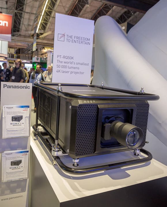Panasonic hat seinen ersten Laserprojektor mit 50.000 lm und 3-Chip DLP Technologie vorgestellt. Der PT-RQ50K bietet eine Auflösung von Nativem 4K. Besonderheit des Projektors ist die Verwendung einer weiteren roten Laserdiode zur herkömmlichen mit Phosphor angereicherten blauen Diode. Dadurch soll das Farbspektrum vor allem im roten Bereich erweitert werden. Diese Lösung wird bei Panasonic mit dem Begriff Solid Shine Laser benannt. Der Panasonic PT-RQ50K ist im gleichen Gehäuse untergebracht, wie die 30.000 lm Projektorserie von Panasonic – zum letztendlichen Gewicht konnte jedoch noch keine Aussage am Stand von Panasonic getätigt werden. Objektive wird es ebenfalls neue geben – sechs an der Zahl wurden bisher bestätigt.
