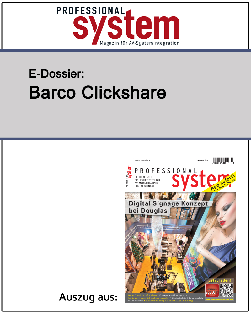 Auflösungstreues Präsentieren ohne Verkabelungsaufwand mit Barco ClickshareFast jeder Technikleiter oder Verantwortliche für Meeting- oder Konferenzräume kennt das Problem: Unerwartet wird eine Besprechung oder eine Präsentation anberaumt, oft mit mehreren Teilnehmern und unterschiedlichsten Präsentationsquellen. In Windeseile muss die vorhandene Schalttechnik diesen Quellen – Laptops, Netbooks – angepasst werden, damit die vorhandene Präsentation in bestmöglicher Performance per Projektor auf der Bildwand oder auf dem Flachbildschirm erscheint. Je nach Ausstattung der fest installierten AV-Schalttechnik kann die Vorbereitung bis zum Start der Präsentation ein zeit- und nervenraubender Prozess sein – sowohl für den Techniker als auch den Präsentator. Barco bietet eine Lösung: Das „Clickshare“-System verspricht ein einfaches, auflösungstreues Präsentieren ohne Verkabelungsaufwand und ermöglicht eine neue Form des Präsentierens.