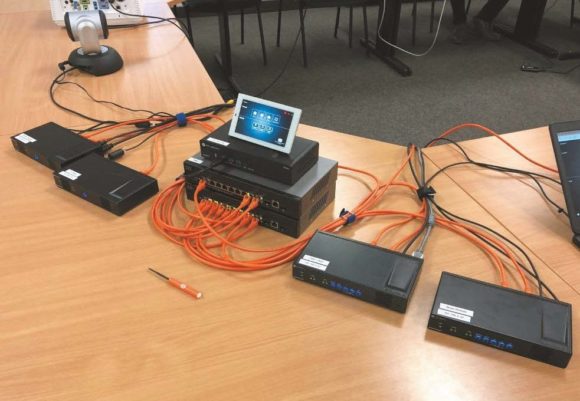 Für die Praxisdemo wurden drei Zwei-Kanal-Dekoder mit Informationen aus zwei Videozuspielern, einem Mini-PC und einem Laptop versorgt. Der Velocity-Prozessor übernahm die Steuerung über die verbundenen Touch-Displays und ein Tastenfeld. Der PoE-fähige Switch versorgt hierbei einen Großteil der angeschlossenen OmniStream-Geräte (Bild: Atlona)