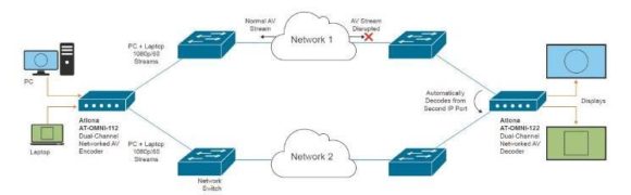 In einer redundanten Netzwerk-Konfiguration kann der Decoder bei Verbindungsproblemen oder -abbruch beide HD/60Hz-Datenströme (zukünftig auch 4K/30Hz) über die jeweils noch vorhandene Verbindung zusammenfassen. Für eine Redundanz bei 4K/60Hz-Inhalten muss die Infrastruktur auch bei den En- und Decodern gedoppelt werden.. (Bild: Atlona)