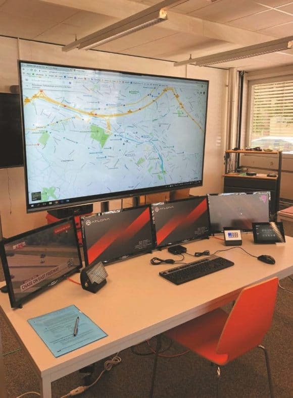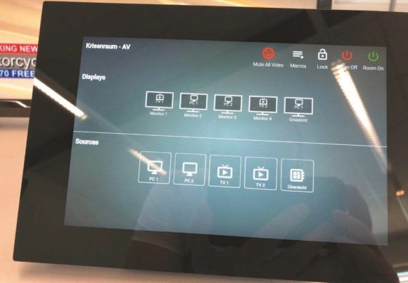 In dieser Demo wurde der Aufbau eines Krisenraums bei der Polizei simuliert. Über mehrere Bildschirme verteilt können TV-Signale, entfernte Rechner mit KVM-Funktion und Leitwarteninformationen dargestellt werden. Über die Velocity- Touchscreens und das Tastenfeld sind verschiedene Presets abrufbar, die die Signale auf unterschiedlichen Bildschirmen verteilen oder auf andere AV-Datenströme umschalten. (Bild: Atlona)