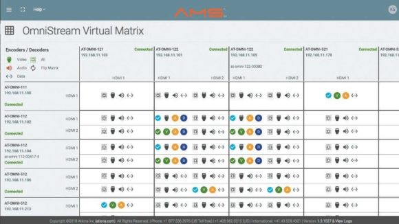 Die Verwaltung des AMS funktioniert ganz ähnlich einer klassischen Videomatrix. Hierbei findet das AMS automatisch alle verfügbaren OmniStream-Geräte im Netzwerk und listet diese in der virtuellen Matrix auf. Darüber hinaus dient das AMS auch für ein Monitoring der angeschlossenen Komponenten, erstellt Backups der aktuellen Konfiguration und kann zentral alle verbundenen Geräte mit Updates versorgen. Neben der Konfiguration über ein Webinterface bietet die AMS-Hardware-Lösung auch einen HDMI- und 4 USB-Ports um lokal mit Bildschirm und angeschlossener Tastatur und Maus zu arbeiten.