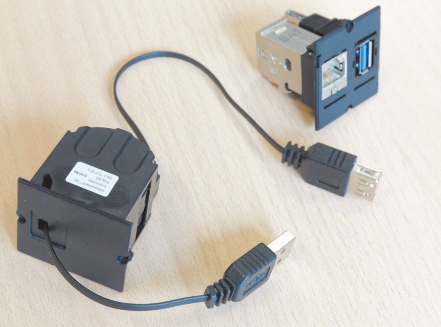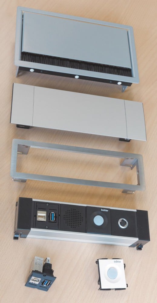 Die DIGIMIC lean+ Module (siehe Kasten) sitzen in einem Aluminiumprofil, das unterschiedliche Längen aufweisen kann und von zwei Endkappen aus Kunststoff zu den Seiten hin abgeschlossen wird. Eine fertig zusammengestellte Modulleiste lässt sich werkzeuglos in einen standardisierten Bachmann Rahmen einsetzen, woraus sich ein sehr interessanter Aspekt für Installer ergibt: Die Rahmen können bereits zu einem frühen Zeitpunkt in die Tische integriert werden, während die Technik erst dann eingebracht wird, wenn bei Neu- oder Umbauten die groben Arbeiten abgeschlossen und die Räume besenrein sind.