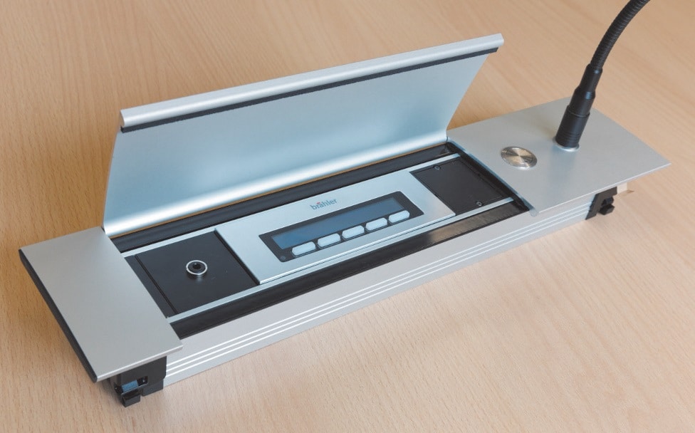 Die von Brähler konzipierten DIGIMIC lean+ Module wurden hinsichtlich ihres äußeren Erscheinungsbildes an die Einbaurahmen adaptiert, wobei für die Entwickler eine besondere Herausforderung darin bestanden haben dürfte, die vorhandene Technik passend zum begrenzten Rahmen-Raumangebot zu miniaturisieren. „In meinen Augen wurde das Thema Design von der Konferenztechnikindustrie sehr lange vernachlässigt“, erklärt Axel Heppener, der bei der Brähler ICS Konferenztechnik International Congress Service AG für das strategische Marketing zuständig ist und über einen Background als Designer/Ergonomiefachmann verfügt.