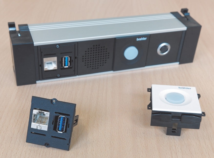 Bachmann Keystone-Medientechnikmodule ohne lokale Stromversorgung können dank freier Plätze durch einfaches Einstecken jederzeit nachgerüstet werden. Interessant ist der Gedanke, bei Bedarf einzelne Konferenztechnikmodule auswechseln zu lassen, statt die gesamte Sprechstelle neu anschaffen zu müssen. Das Angebot von derzeit acht verfügbaren Brähler Konferenztechnikmodulen soll bereits in Kürze erweitert werden.