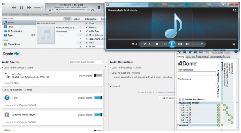 Dante Via ist eine Software-Lösung, die automatisch Audioschnittstellen eines Rechners erkennt. Sie ermöglicht es, Audioquellen wie angeschlossene oder integrierte Mikrofone, Media-Player etc. den Ausgabemedien wie integrierte oder angeschlossene Lautsprecher oder Aufnahme-Software auf einer Bedienoberfläche per Drag & Drop zuzuweisen. Dabei ist es egal, ob der Rechner ein Mac oder PC ist – es gibt für beide die passende SoftwareVersion. Selbst wenn man lediglich einen Rechner nutzt, eröffnen sich neue Wege: Man kann z. B. eine Quelle wie iTunes mehreren Ausgängen zuweisen oder den Player wechseln. Eine Signalverteilung wird damit kinderleicht. Wird der Rechner dann über seine Netzwerkschnittstelle mit Dante-Geräten verbunden, können die Signale auch wechselseitig mit dem DanteNetzwerk ausgetauscht werden. Per Kabel im Netzwerk verbundene Rechner können ebenfalls Signale austauschen. So kann das Signal von iTunes auf dem Rechner A oder das Signal eines per USB angeschlossenen Mikrofons etwa über die Audioausgänge am Rechner B ausgespielt werden. Mit Dante Via also können Rechner zum umfassenden Signalverteiler werden, auch in einem rein Rechner-basierten Netzwerk.