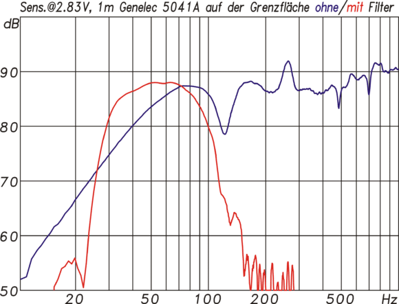Der Frequenzgang in Abb.04 deutet mit dem Einbruch bei 120 Hz ebenfalls darauf hin. Zusammen mit dem zugehörigen RAM3 Verstärker (rote Kurve) spielt das jedoch alles keine Rolle mehr. Als Subwoofer wird der A5041 nur bis knapp unter 100 Hz eingesetzt und darüber hinaus steil ausgeblendet. Am unteren Ende reicht die Kurve bis knapp unter 30 Hz, womit auch die Anforderungen als LFE-Lautsprecher im Kinosystem weitgehend erfüllt werden. Anhänger einschlägiger Action Streifen, in denen kaum eine Szene ohne Explosionen oder Erdbeben auskommt, dürften damit zwar nicht zufrieden sind, für den normalen Filmgenuss reicht es aber in jedem Fall.