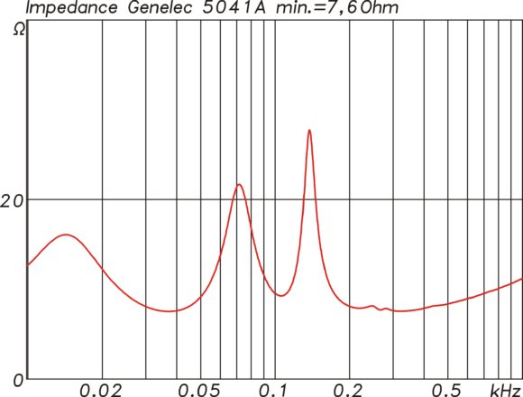 Ähnlich der AIW26B wurde auch der 5041A Subwoofer zunächst ohne seinen zugehörigen Verstärker gemessen. Die Impedanzkurve aus Abb.03 zeigt dazu einen etwas ungewöhnlichen, eher für einen Bandpass typischen Verlauf mit drei Maxima. Der Grund könnte in den extremen Gehäuserelationen zu finden sein, die das Volumen nicht mehr als eine Einheit agieren lassen, woraus zusätzliche interne Resonatoren entstehen.