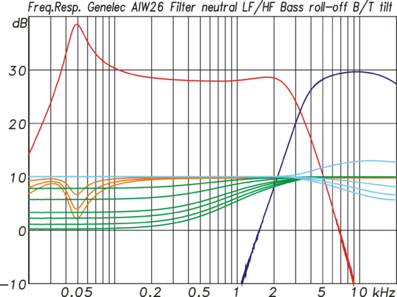 Abb. 05: Filterfunktionen im Verstärkermodul für die AIW26 für den Tieftöner (rt) und für den Hochtöner (bl) sowie die Filter zur Ortsanpassung.
