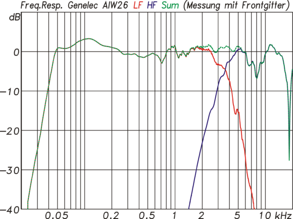 Abb. 07: Gesamtfrequenzgang (gr) der AIW26 als Summe aus Tieftöner(rt) und Hochtöner(bl) mit Controller.