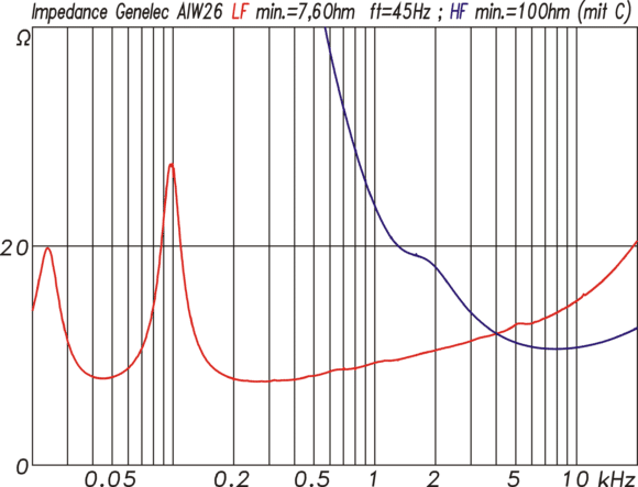 Abb. 01: Impedanzkurven des Tieftöners(rt) und Hochtöners(bl) in der AIW26. Dem Hochtöner ist zum Schutz ein Kondensator vorgeschaltet.