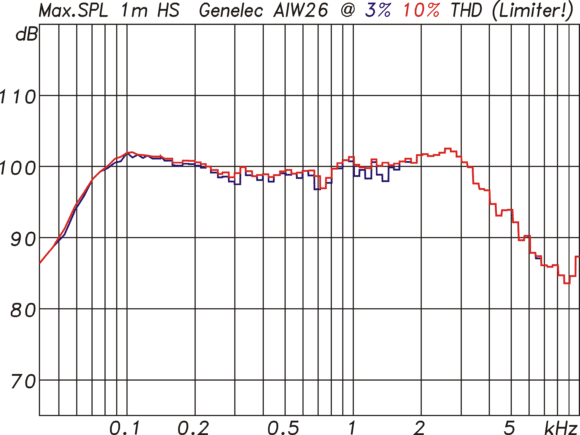 Abb. 11: Maximalpegel der AIW26 gemessen mit 185 ms langen Sinusburst für maximal 3%(bl) und 10%(rt) Verzerrungen. Diese Werte werden nicht erreicht, da bei dieser Art der Messung der Limiter schon frühzeitig eingreift.