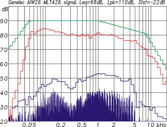 Subtrahiert man nach der Übertragung dieses Signals über den Lautsprecher alle 60 Spektrallinien des Anregungssignals, verbleiben nur die neu hinzugekommene Anteile, die sich aus den vom Lautsprecher erzeugten harmonischen Verzerrungen (THD) und allen Intermodulationsverzerrungen (IMD) zusammensetzen. Die Bezeichnung dafür ist TD für Total Distortions als Summe aus THD und IMD. Aus den Messungen lassen sich drei Werte ableiten: Der schon genannte TD-Wert, der hier wieder als Grenzwert mit 10% festgelegt wurde, der dabei erreichte Mittlungspegel Leq und der Spitzenpegel Lpk. Bei 10% TD erreicht die AIW26B einen Mittlungspegel von 98 dB und einen Spitzenpegel von 110 dB. Knapp darüber setzten dann wieder die Limiter ein, so dass die Messung den echten Maximalpegel repräsentiert. Die Verzerrungsanteile verteilen sich gleichmäßig und es sind keine direkten Schwachstellen sichtbar. Im Datenblatt werden 120 dB für ein Pärchen der AIW26B angegeben. Der Wert ist ohne Angabe von Verzerrungswerten und vermutlich mit einem Pinknoise bei voller Aussteuerung ermittelt, so dass die Angabe in Relation zu den hier gemessenen 110 dB Peak für einen einzelnen AIW26B realistisch erscheint.