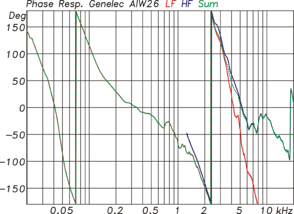 Beides funktioniert bei der AIW26B erwartungsgemäß bestens. In Abb.07 finden sich dazu die Amplitudenverläufe des Tiefton- (rt) und des Hochtonzweiges (bl) sowie deren Summe (gr). Abb.08 zeigt die zugehörigen Phasengänge, die zwischen 2 und 4 kHz vorbildlich deckend verlaufen. Die AIW26B im Ganzen weist 360° Phasendrehung durch die Trennung der beiden Wege, 360° durch die akustische Hochpassfilterfunktion des Bassreflexgehäuses und weitere 180° durch das zusätzliche elektrische Hochpassfilter auf. Unregelmäßigkeiten gibt es dabei weder in der Phase noch in der Amplitude.