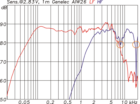 Abb. 02: Frequenzgang mit Sensitivity des Tieftöners(rt) und Hochtöners(bl) in der AIW26