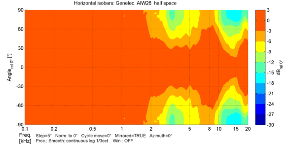 Bestimmt wird das räumliche Abstrahlverhalten eines Lautsprechers neben der Ausdehnung der Strahlerfläche (Membrandurchmesser) und des Einbaus auch noch durch zusätzliche Schallführungen. Ist der Membrandurchmesser klein gegenüber der Wellenlänge, dann strahlt die Membran rundum gleichmäßig ab. Kommen beide in vergleichbare Größenordnungen oder kehrt sich das Verhältnis um, setzt eine zunehmende Bündelung bei der Schallabstrahlung ein. Für die AIW26B ist dieser Effekt in Abb.09 ab 2 kHz zu beobachten, wo der Membrandurchmesser des 7“-Tieftöners in die Größenordnung der Wellenlänge (17 cm bei 2 kHz) kommt.