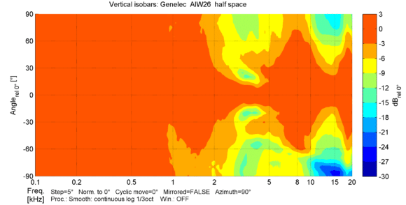 Im globalen Verlauf ähnlich, aber mit einer deutlichen Einschnürung bei der Trennfrequenz stellen sich die vertikalen Isobaren aus Abb.10 dar. In der vertikalen Ebene kommt es im Gegensatz zur horizontalen durch winkelabhängige Laufzeitunterschiede zwischen Hoch- und Tieftöner zu Interferenzeffekten. Diese sind prinzipbedingt und lassen sich bei übereinander angeordneten Lautsprechern nicht vermeiden. Ein steilflankiger Übergang kann jedoch den betroffenen Frequenzbereich einengen. Komplett vermieden werden könnten diese Effekte nur durch eine koaxiale Anordnung der beiden Wege. Sieht man über die Artefakte der Isobarendarstellung und den schmalen Interferenzbereich bei der Trennfrequenz hinweg, dann könnte man den mittleren Abstrahlwinkel der AIW26B ab 2 kHz aufwärts mit 100×100 Grad gut beschreiben.