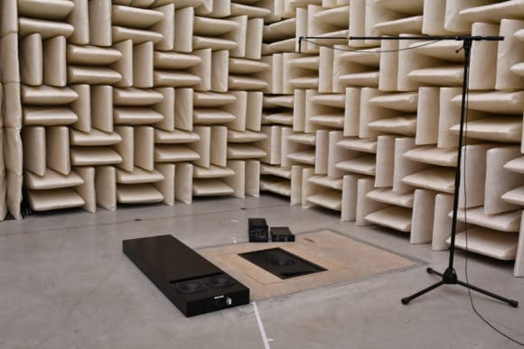 AIW26B und Subwoofer im Messraum. Der AIW26B wurde in der Grenzfläche eingebaut und der 5041A auf der Grenzfläche betrieben, da der Einbau aufgrund der Größe nicht möglich war. Im Hintergrund die für das Foto dort aufgestellten Verstärkermodule. (Bild: Anselm Goertz)