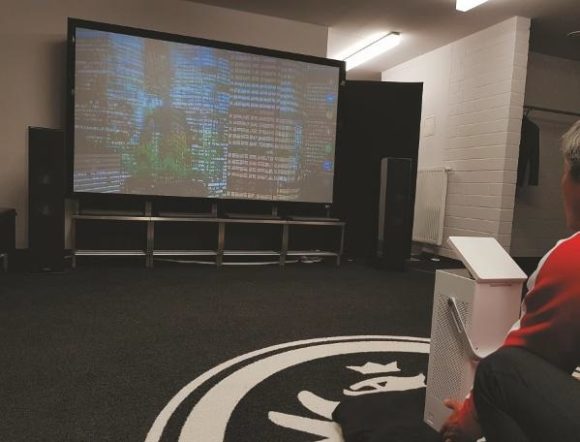 Nach der Pressekonferenz konnte der neue Projektor in der Spielerkabine der Eintracht begutachtet und ausgiebig getestet werden. Durch die Pixelshift-Technologie bei 4K-Inhalten war keine Pixelstruktur mit dem Auge direkt an der Leinwand erkennbar – das Bild war gestochen scharf und wirkte plastisch. In einer ersten Demo wurden Inhalte vom internen Medienplayer wiedergegeben. Auch das Upscaling von HD-Inhalten nahm der Projektor annehmbar vor, wobei man aber doch lieber 4K-Inhalte sehen möchte.