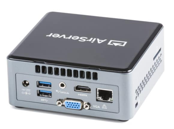 Durch seine kompakte Bauweise mit gerade mal 11,5 × 11,5 × 5 cm kann der Mini-PC einfach in der Nähe eines Bildschirms integriert oder auch per VESA-Mount-Standard am Display montiert werden. Mit dem beiliegenden externen Netzteil wird der AirServer mit Strom versorgt und per HDMI-Kabel an ein Display angeschlossen.