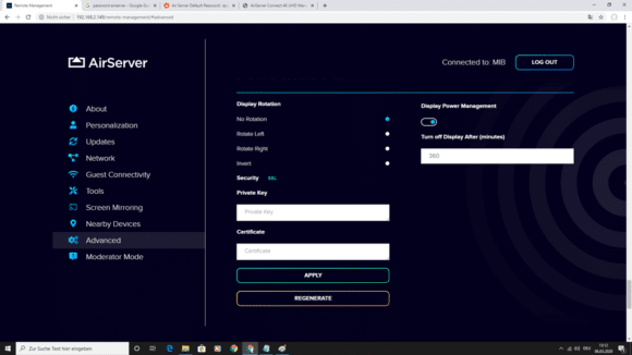 Auch wenn der AirServer auf einem Intel NUC basiert, kommt man an das Linux-basierte Betriebssystem nicht ohne Weiteres ran. Auf dem angeschlossenen Display ist nur das rudimentäre AirServer-System zu sehen, in dem man mit einer angeschlossenen USB-Maus sowie -Tastatur einige Grundeinstellungen festlegen kann. Diese und einige weitere Einstellungen lassen sich aber auch über ein Webinterface vornehmen, das über die IP-Adresse des entsprechenden AirServers zu erreichen ist.