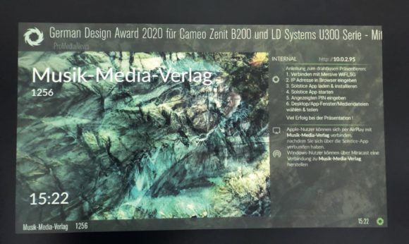 Der Solstice Welcome Screen zeigt dabei den Raumnamen bzw. im Mersive-Jargon den Displaynamen an, den man in seiner App nun suchen und zur Verbindung auswählen kann. Darunter befindet sich der Screen Key, der bei Verbindungsaufbau abgefragt wird. Außerdem kann im Hintergrund ein Bild oder eine Slideshow angezeigt und die lokale Uhrzeit eingeblendet werden. Am rechten Rand befindet sich ein vom Hintergrund farbig abgehobener Bereich, der die IP-Adresse des Pods über W-LAN und, falls eingerichtet, auch über LAN anzeigt. Darunter befindet sich eine Anleitung zur Verbindung mit dem Pod, die auch angepasst und erweitert werden kann.