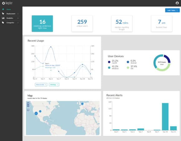 Mersives cloudbasierte Monitoring-Plattform Kepler bietet Echtzeit-Überwachung der anonymen Nutzungsdaten, Metriken und intuitive Analysen. (Bild: Mersive)