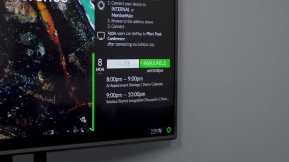 Die Integration eines Raumkalenders bietet die Möglichkeit, die Verfügbarkeit des Raumes auf dem Welcome Screen und auch in der Solstice User App darzustellen. (Bild: Mersive)